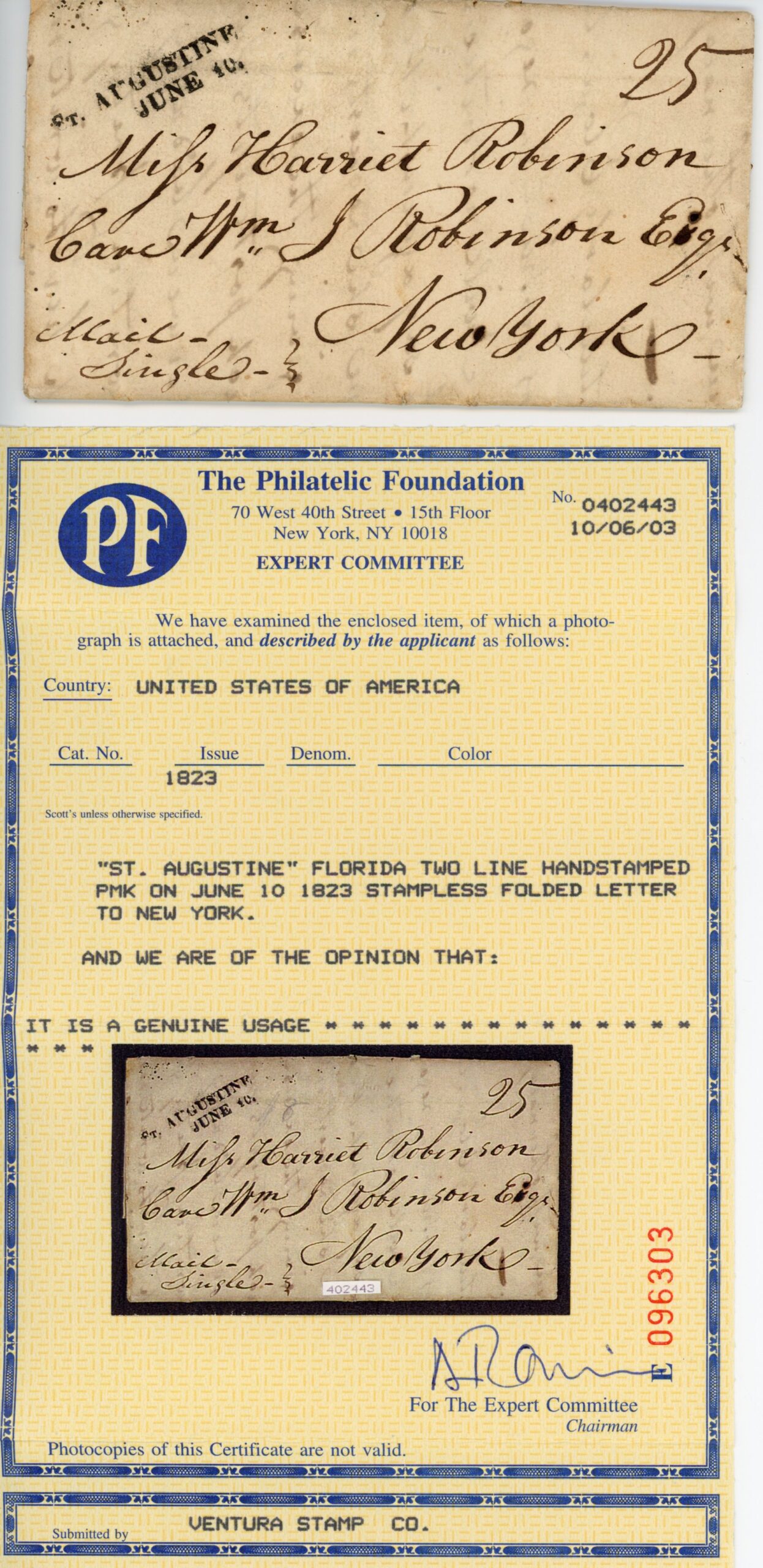 1805, Portsmouth, Va. to St. Augustine, Florida. Folded letter datelined “Portsmouth Virginia August 29th 1805”  sender’s routing instructions “Mail” at lower left, no postal markings, there was no mail service between the United States and Spanish-held Florida.  Listed in Briggs book. RARE